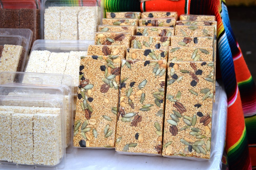 Alegría ist eine traditionelle mexikanische Süßigkeit aus gepufftem Amaranth, verfeinert mit Honig oder Zucker. Sie wird oft mit Nüssen oder getrockneten Früchten vermischt und zu kleinen, knusprigen Kuchen geformt – ein echter Geschmack der Freude.