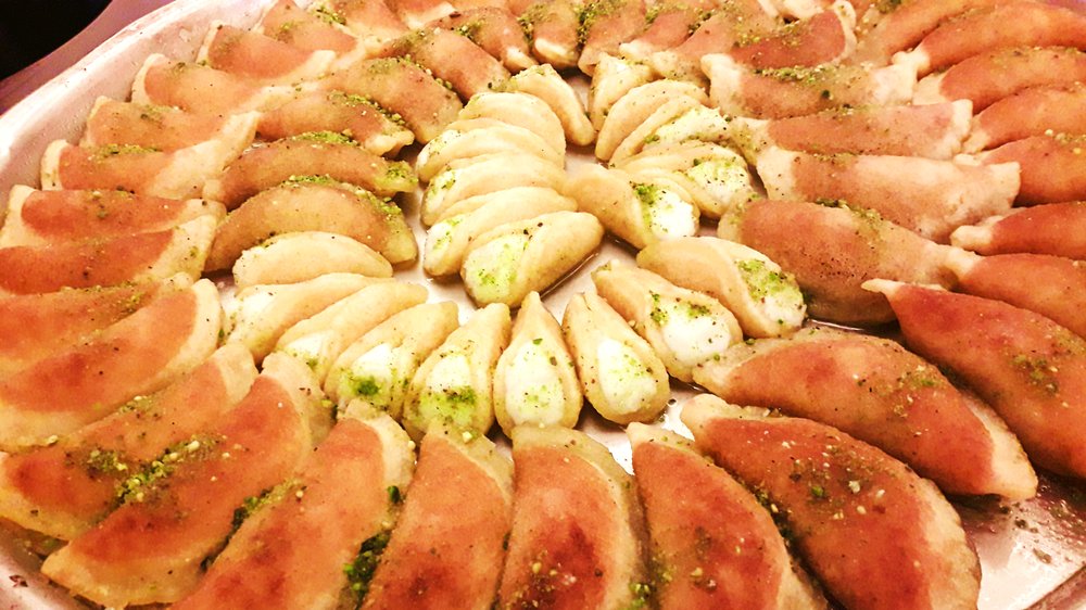 Gefüllte und frittierte Pfannkuchen aus der arabischen Levante. Sie bestechen durch ihre knusprige Hülle, eine aromatische Walnussfüllung und duftenden Rosenwasser-Zuckersirup.