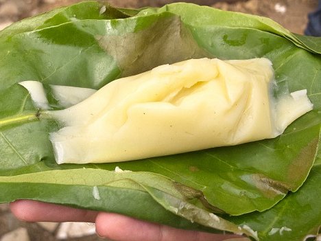 Jeweils eine Kelle des heißen Maisbreis mittig auf ein Bananenblatt geben. Die Blätter darüber zusammenfalten, sodass kleine Päckchen entstehen.