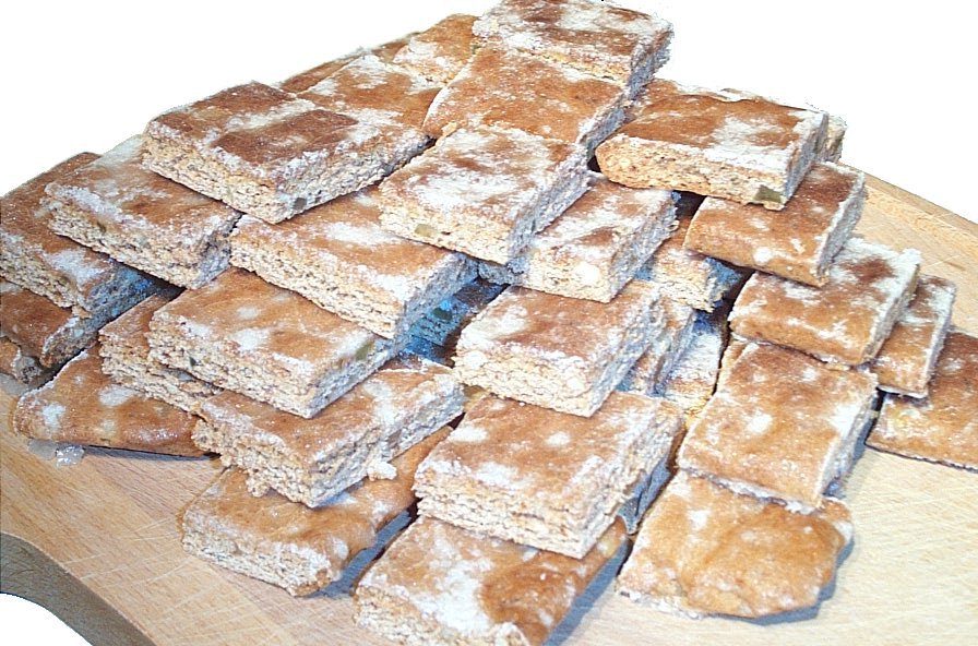 Ein traditionelles Schweizer Lebkuchengebäck aus Basel, bekannt für seine feine Honignote und die Mischung aus Nüssen und kandierten Früchten. Die rechteckigen Stücke werden klassisch mit einer Zuckerglasur überzogen.