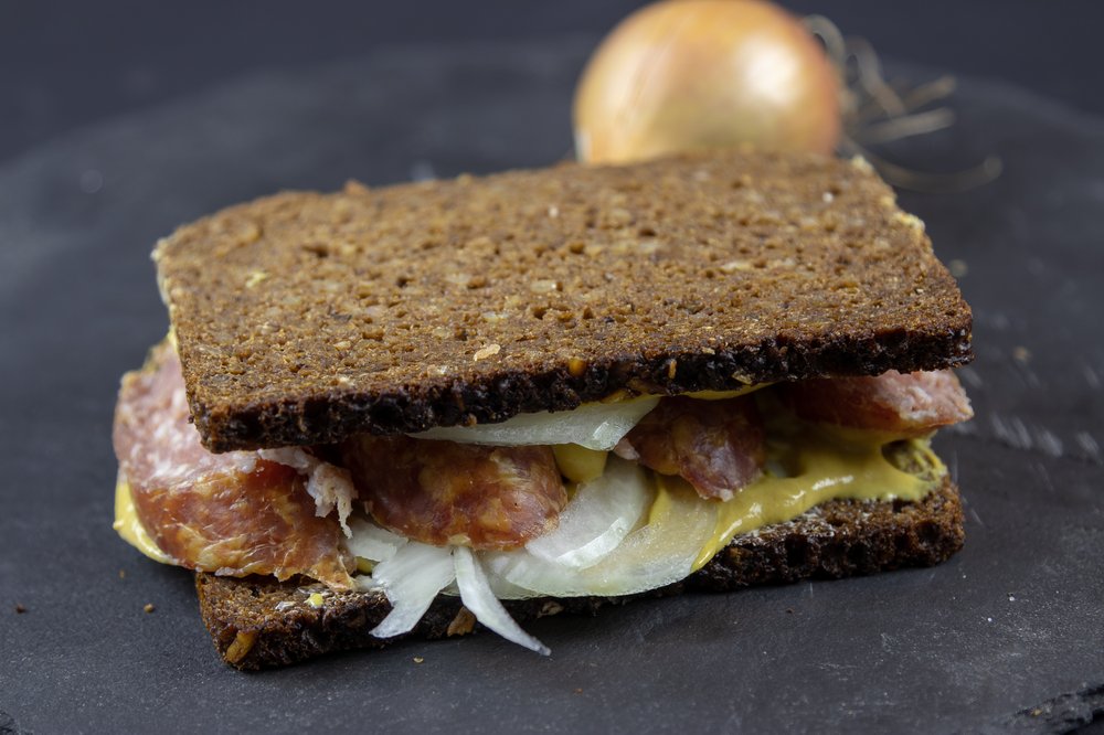Ein herzhaftes Doppel-Butterbrot aus dem Bergischen Land, traditionell belegt mit geräucherter Mettwurst, frischen Zwiebeln und Senf. Diese rustikale Mahlzeit diente einst den Arbeitern in den Schleifkotten als kräftige Stärkung.