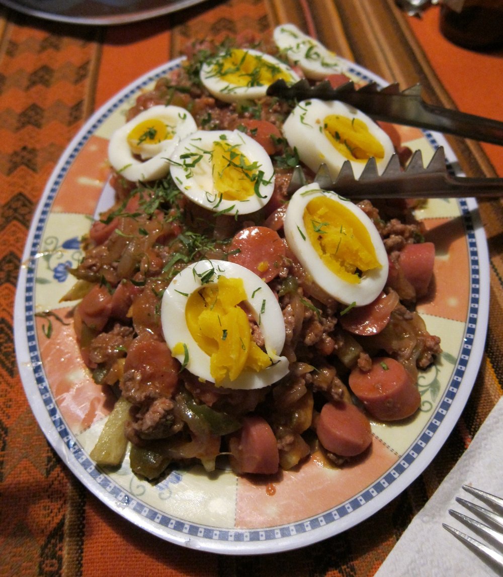 Ein herzhafter chilenischer Eintopf aus Rindfleisch, Kartoffeln, Kürbis und Mais. Dieser Klassiker der Andenküche wird traditionell leicht gestampft und mit einem Spiegelei serviert.