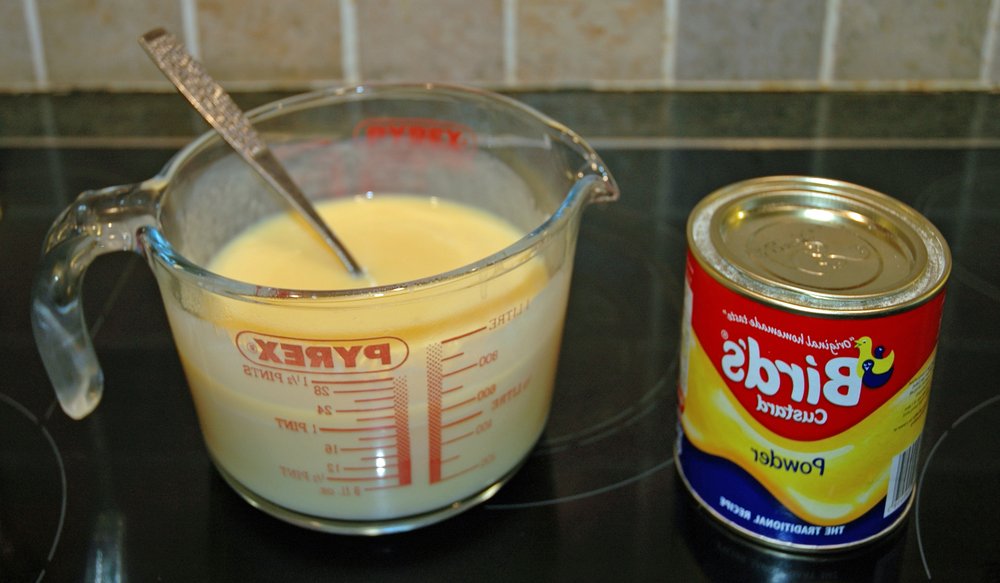 Das Custardpulver mit etwas kalter Milch (ca. 50 ml) zu einer glatten Paste verrühren, um Klumpen zu vermeiden.