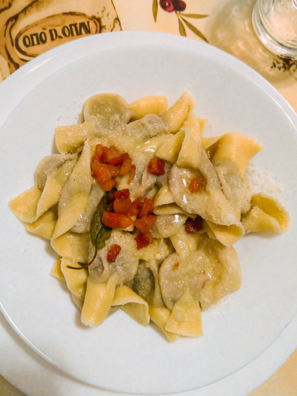Traditionelle gefüllte Teigtaschen aus dem Friaul, die für ihren einzigartigen süß-herzhaften Kontrast bekannt sind. Die Füllung vereint Kräuter mit süßen Gewürzen, serviert mit geschmolzener Butter und Rauchkäse.