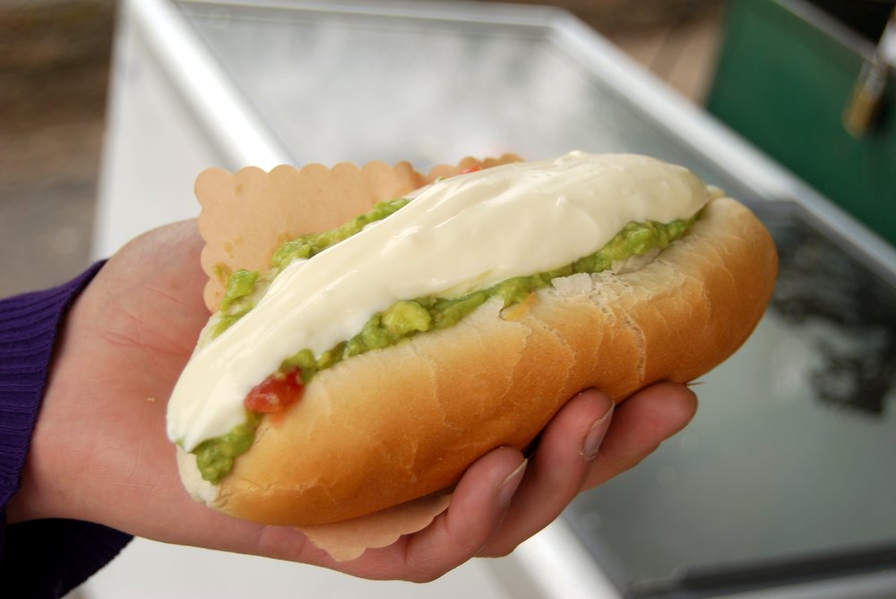 Ein üppiger Klassiker der chilenischen Imbisskultur. Dieser Hotdog wird reichhaltig mit Sauerkraut, Tomaten, Avocadocreme und Mayonnaise belegt.