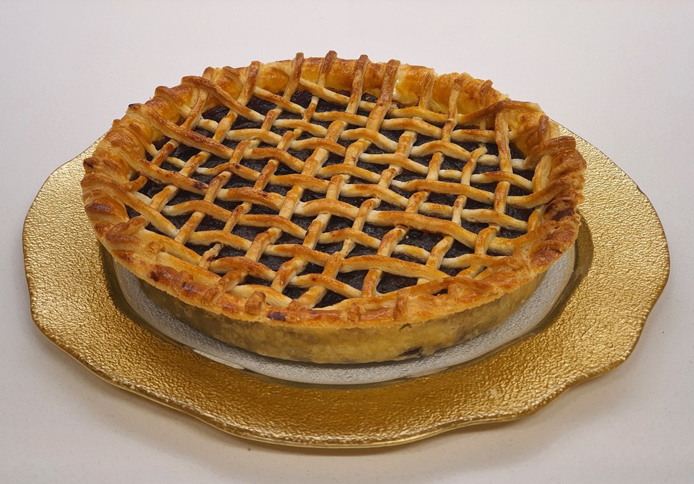 Deckel auflegen: Den restlichen Teig ausrollen. Entweder als geschlossenen Deckel auflegen (dabei Schlitze/Nicks einschneiden, damit Dampf entweichen kann) oder in Streifen schneiden und ein Gittermuster legen. Die Ränder gut andrücken.