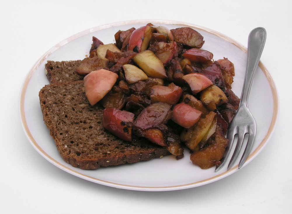 Den Speck zurück in die Pfanne geben oder auf dem Apfelgemisch anrichten. Traditionell heiß oder kalt auf Roggenbrot servieren.