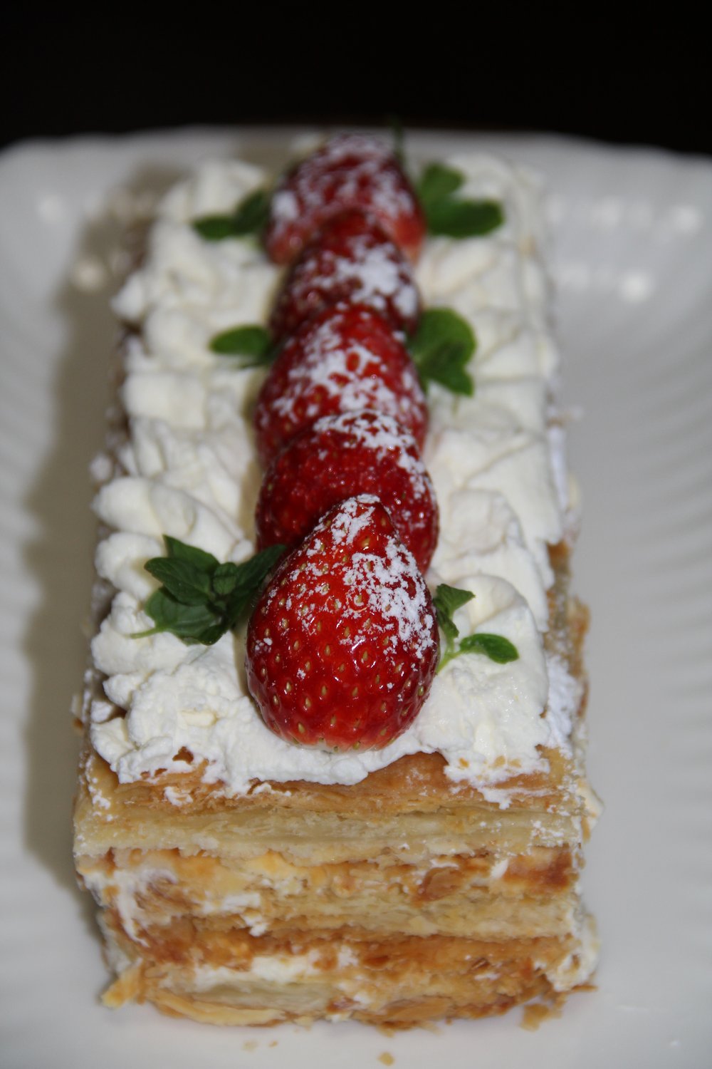 Ein eleganter französischer Kuchen-Klassiker aus drei Schichten knusprigem Blätterteig und feiner Vanillecreme. Charakteristisch ist die Glasur mit dem kunstvollen Marmorier-Muster.