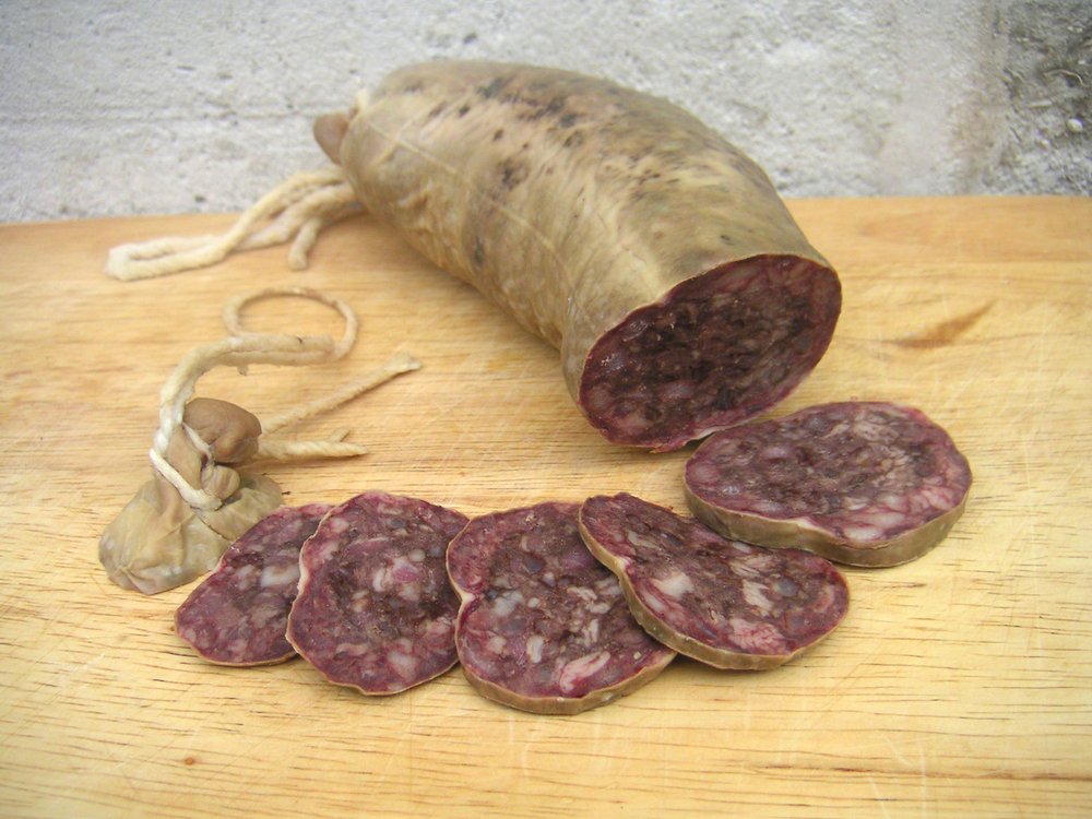 Eine deftige, traditionelle Kochwurst aus Schweinefleisch, Schwarten und frischem Blut. Charakteristisch ist das Pressen während des Abkühlens, was der Wurst ihre feste Schnittfähigkeit und ihren Namen verleiht.