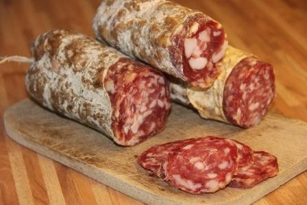 Eine klassische Rohwurst aus Schweinefleisch und Speck, verfeinert mit Rotwein, Knoblauch und typischen Gewürzen. Die Herstellung erfordert Sorgfalt und Geduld für die mehrwöchige Reifung.