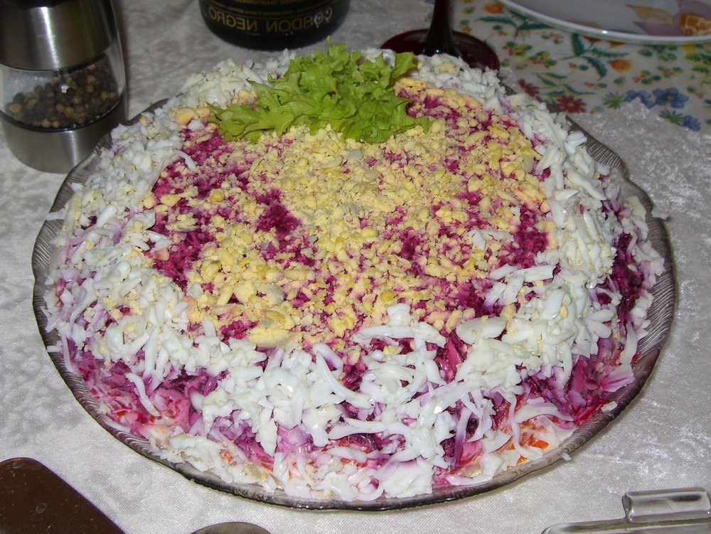 Ein klassisches russisch-jüdisches Festtagsgericht: Schichtsalat aus Hering, Gemüse und Mayonnaise, üppig und herzhaft. Perfekt für Feiertage oder als deftiger Snack.
