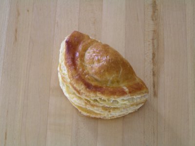 Den Teig zu einem Halbmond zusammenklappen. Die Ränder fest zusammendrücken und nach Belieben kordeln (typisches Muster).