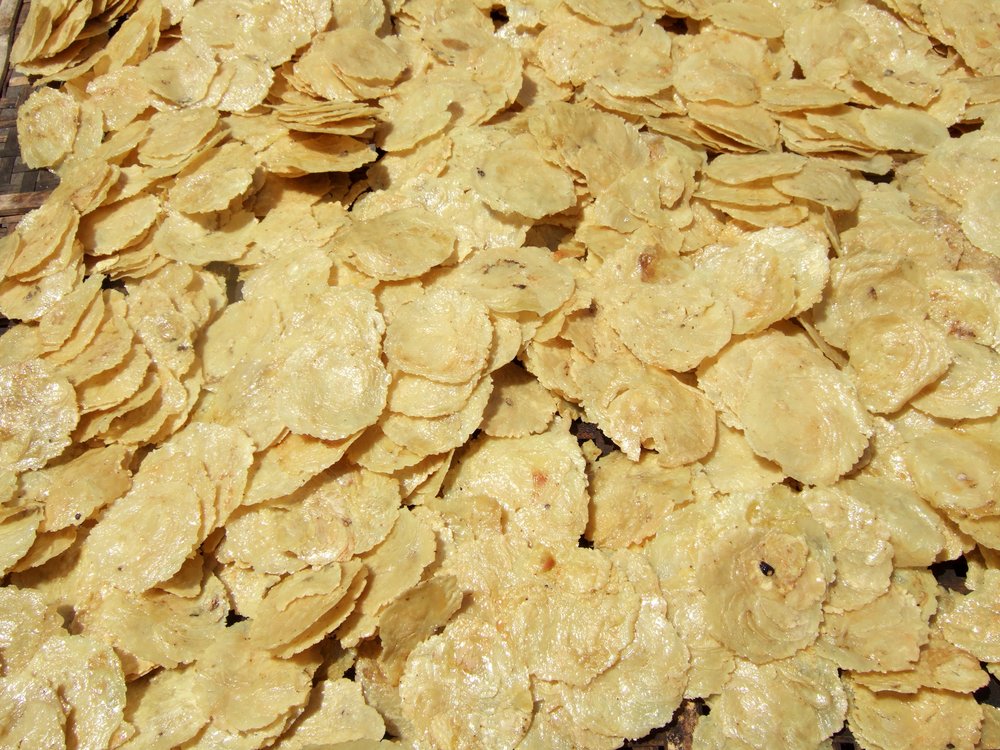 Knuspriges indonesisches Knabberzeug aus den Samen des Melinjo-Baums. Die Chips haben einen charakteristischen, leicht bitteren Geschmack und werden traditionell als Beilage oder Snack serviert.