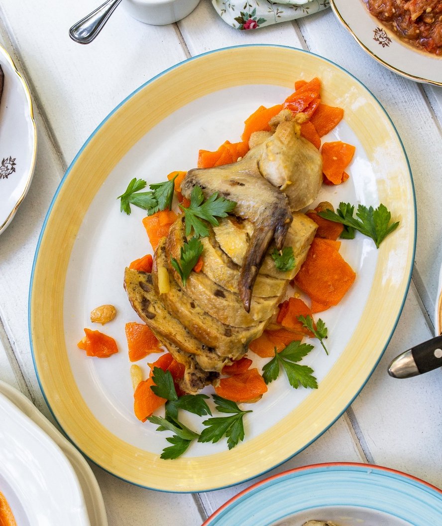 Ein traditionelles Sabbat-Gericht der irakischen Küche, bei dem ein gefülltes Huhn langsam im Reisbett geschmort wird. Durch das lange Garen über Nacht verbinden sich die Aromen von Kurkuma, Huhn und Reis zu einem zarten Gedicht.