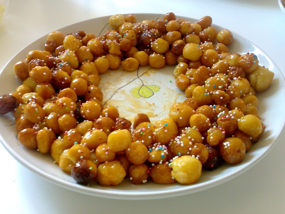 In einem weiten Topf den Honig bei schwacher Hitze verflüssigen (nicht kochen). Die frittierten Bällchen (und optional kandierte Früchte) hineingeben und vorsichtig wenden, bis alle rundherum mit Honig überzogen sind.