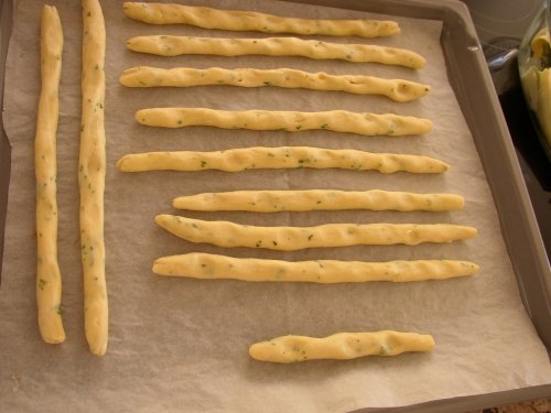 Den Teig in kleine Portionen teilen und auf einer bemehlten Fläche zu fingerdicken, ca. 30 cm langen Stangen rollen.