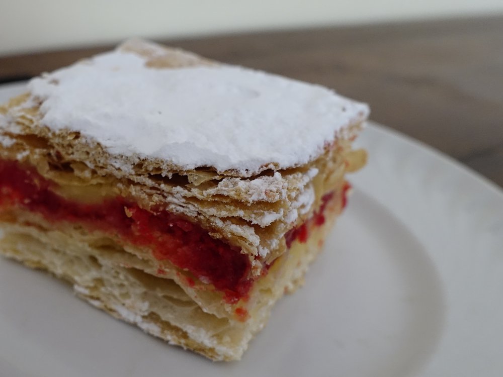 Ein Highlight der österreichischen Mehlspeisenküche aus knusprigem Blätterteig und einer üppigen Vanillecreme-Füllung. Traditionell wird dieses Gebäck in rechteckige Schnitten portioniert und mit Puderzucker bestäubt.