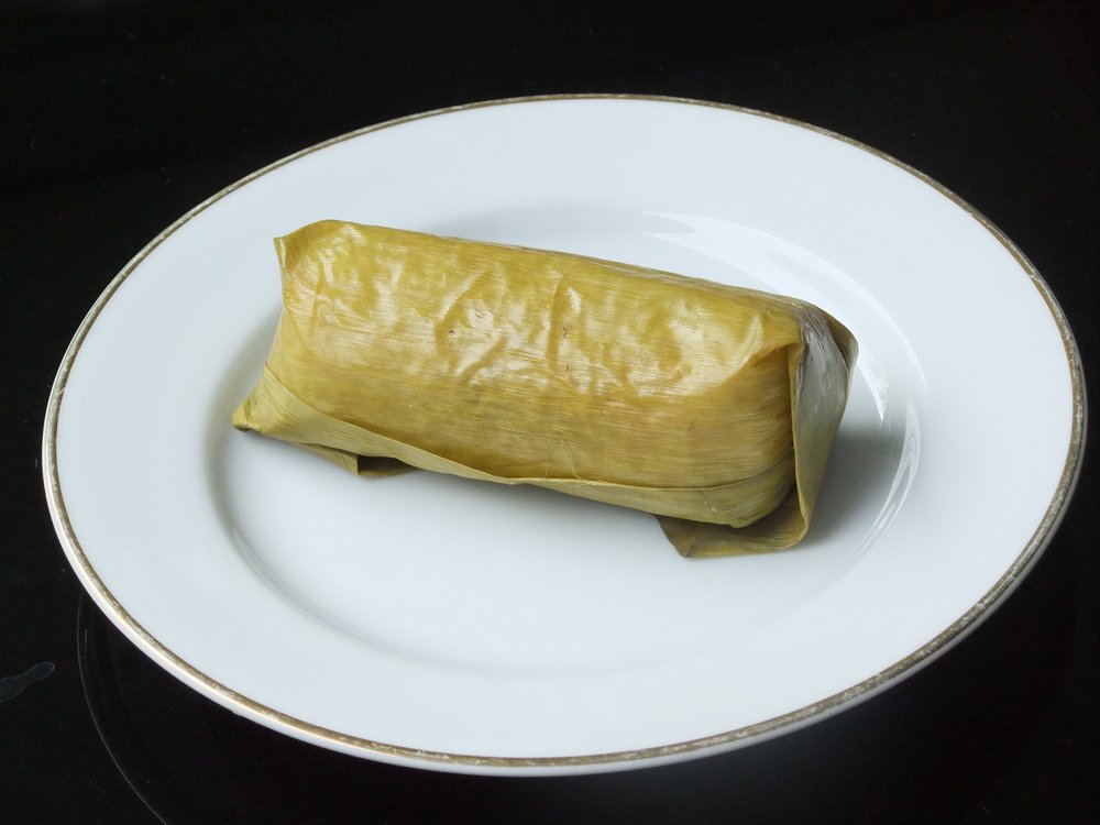 Ein Bananenblatt flach auslegen. Eine Portion Reis in der Mitte verteilen, eine Kelle Füllung daraufgeben und mit Reis bedecken. Das Blatt zu einem Zylinder formen und fest verschließen (mit Holzspieß oder Zahnstocher fixieren).