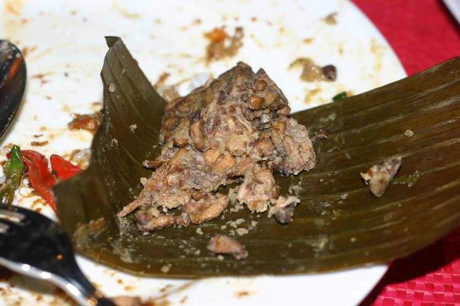 Ein traditionelles Gericht aus Java, das aus frisch geriebener Kokosnuss, würzigem Peda-Fisch und sauren Früchten in Bananenblättern gedämpft wird. Die Kombination aus salzigem Fisch, saurer Belimbing und würzigem Kokos schmeckt intensiv und ist perfekt zu Reis.