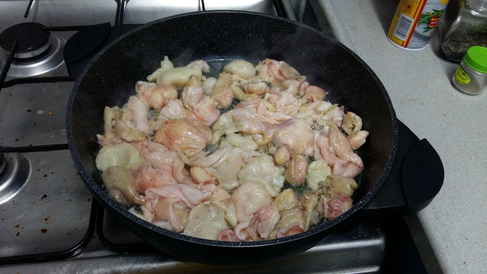 Die Hühner- oder Gänsehaut gründlich waschen, trocken tupfen und in etwa 2-3 cm große Stücke schneiden.
