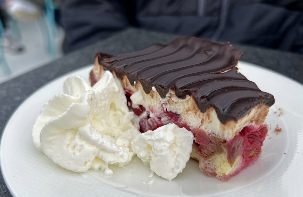 Ein Meisterwerk der deutschen Konditorkunst aus hellen und dunklen Wiener Böden. Gefüllt mit einer Trilogie aus Erdbeer-, Vanille- und Schokoladen-Buttercreme und überzogen mit knackiger Kuvertüre.