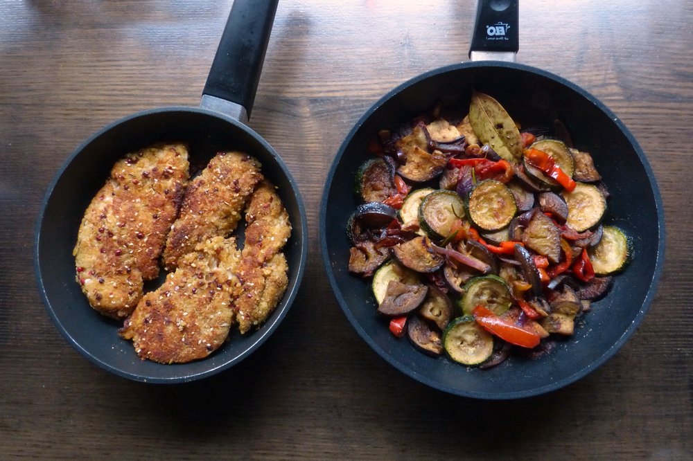 Eine herzhafte Gemüsepfanne aus dem Süden Frankreichs, mit Aubergine, Zucchini und Paprika in würzigem Tomatenfundus. Perfekt als Hauptgericht oder Beilage – weich geschmort oder mit Biss.