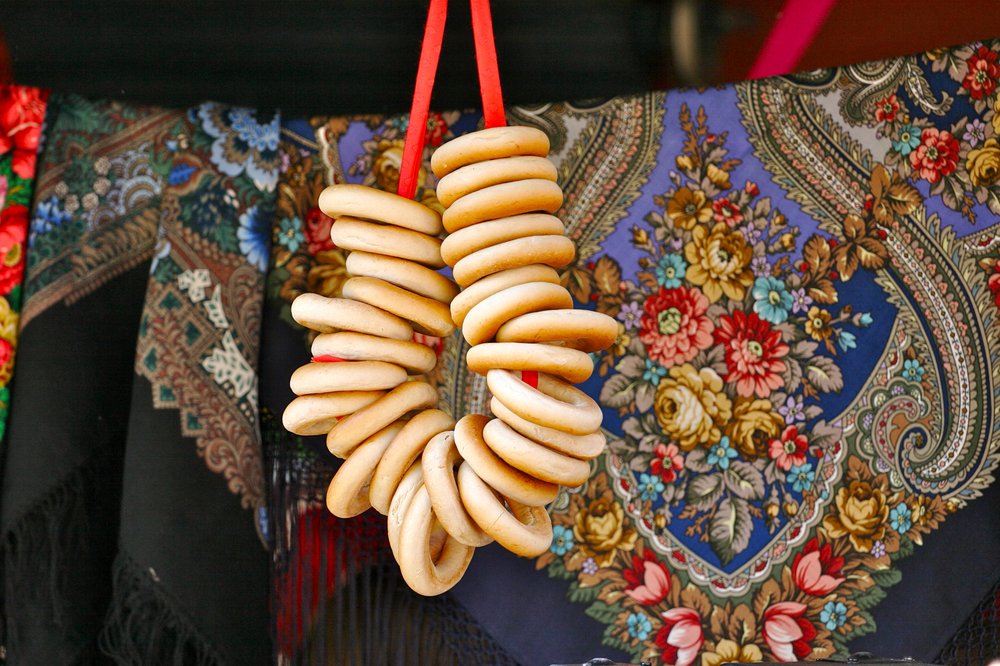 Weiche, leicht süße Hefeteig-Kringel, die traditionell vor dem Backen kurz in heißem Wasser pochiert werden. Sie sind ein beliebter Snack zum Tee in der russischen und ukrainischen Küche.