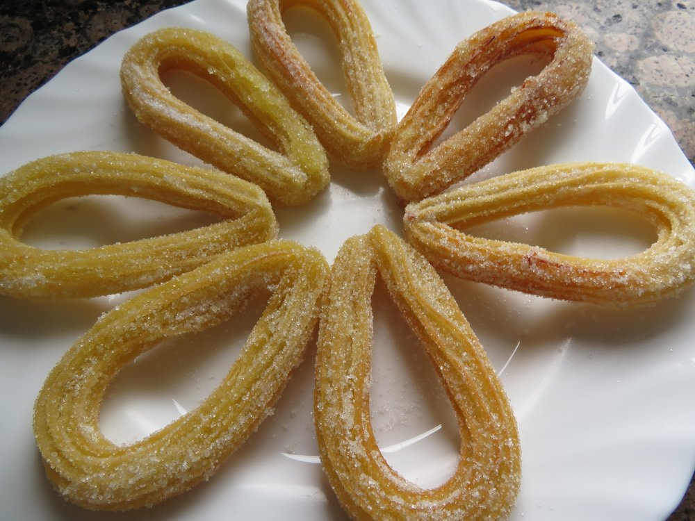 Knuspriges iberisches Fettgebäck aus Brandteig, das in heißem Öl goldbraun frittiert wird. Die sternförmigen Stangen werden traditionell in Zucker gewendet und oft mit heißer Schokolade serviert.