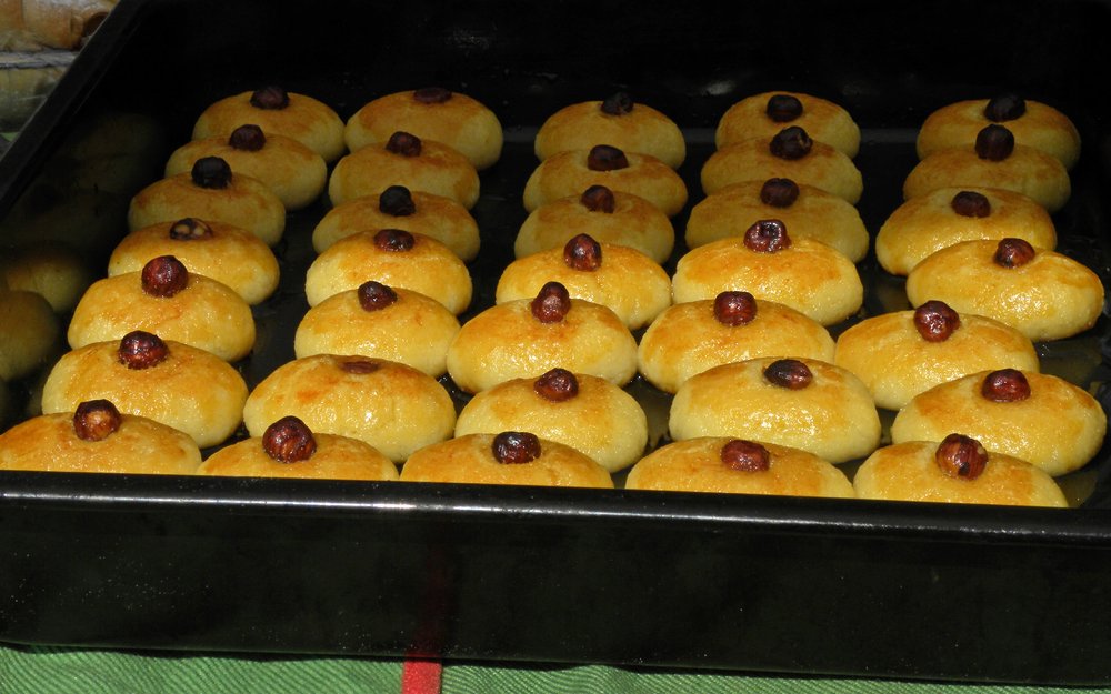 Aus dem Teig walnussgroße Kugeln formen und mit etwas Abstand auf das vorbereitete Backblech legen. In die Mitte jeder Kugel eine ganze Haselnuss oder Mandel drücken.
