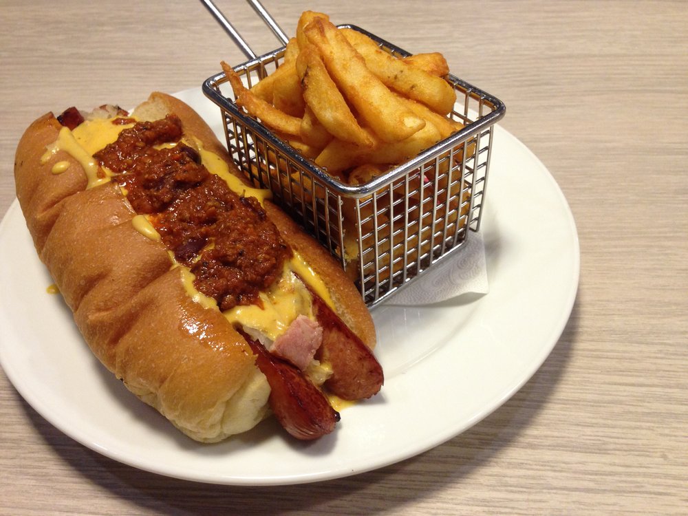 Ein herzhafter amerikanischer Klassiker: Saftiges Würstchen im weichen Brötchen, übergossen mit einer würzigen Hackfleisch-Sauce ohne Bohnen. Perfekt abgerundet mit Zwiebeln, Senf und Cheddar.