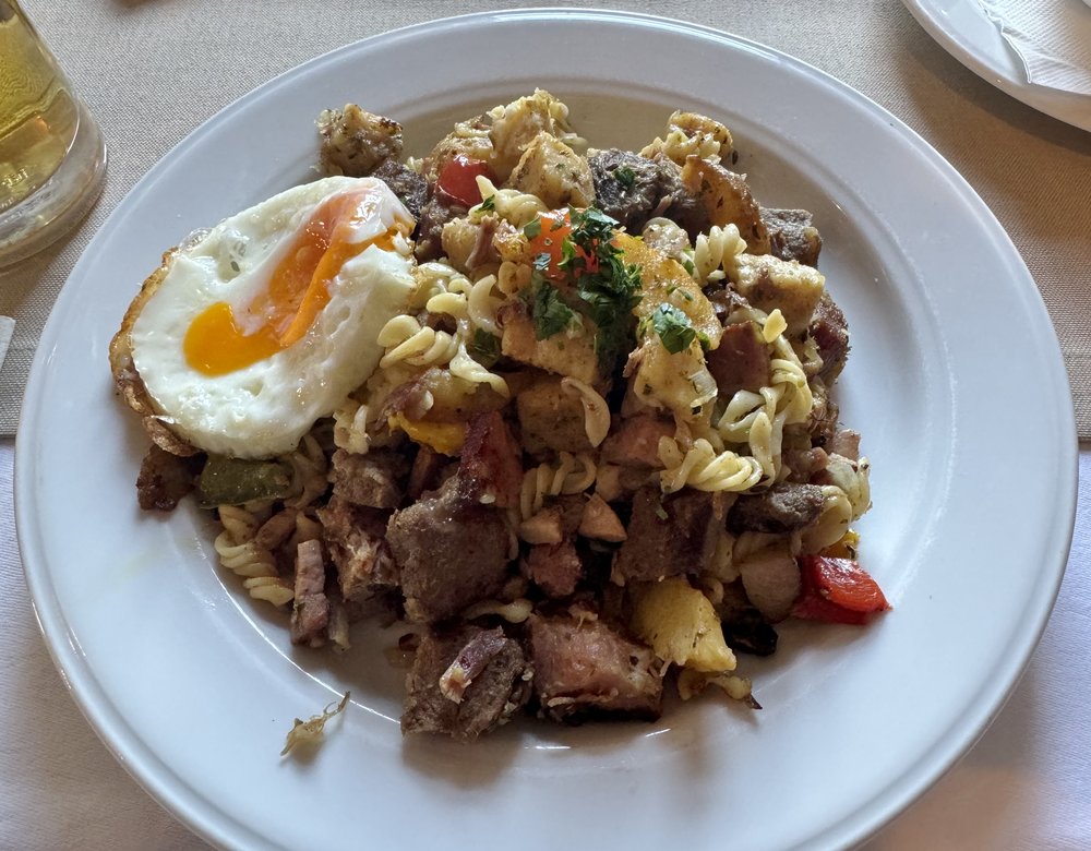 Ein deftiges österreichisches Pfannengericht aus Röstkartoffeln, Fleischstücken und Speck, verfeinert mit Majoran und Kümmel. Traditionell wird dieser Hüttenklassiker mit einem Spiegelei serviert.