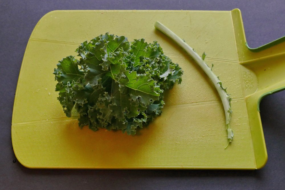 Grünkohl von den dicken Mittelrippen befreien und klein schneiden.