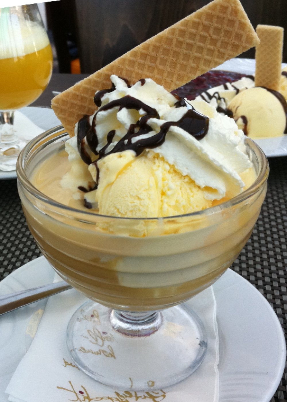 Die geschlagene Sahne großzügig als Haube auf das Eis geben (alternativ mit einem Spritzbeutel aufspritzen).