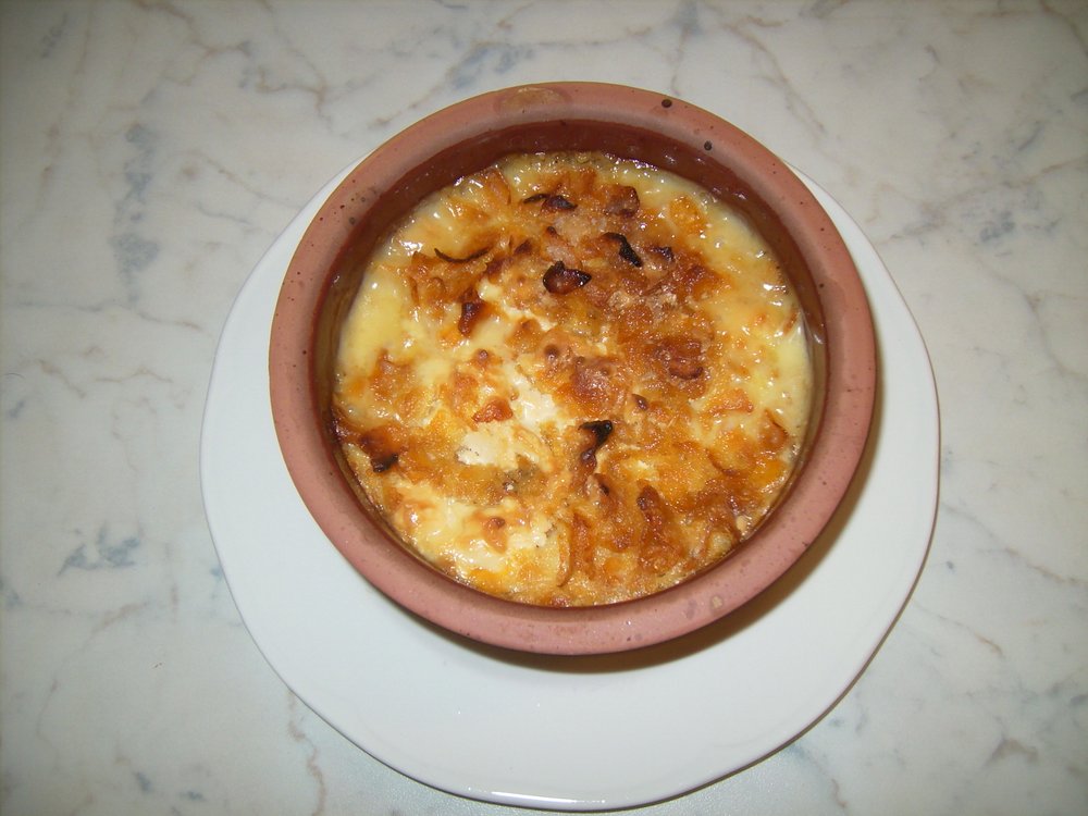 Das Dessert für weitere 10 bis 15 Minuten im Ofen backen, bis die Oberfläche goldbraun gratiniert ist. Warm servieren.