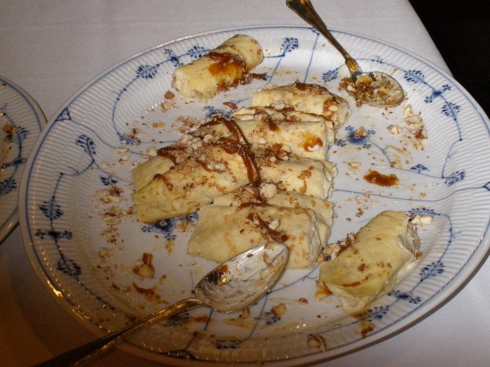 Die berühmteste ungarische Süßspeise nach Károly Gundel. Hauchdünne Pfannkuchen werden mit einer feinen Walnuss-Rum-Creme gefüllt und mit dunkler Schokoladensauce serviert.