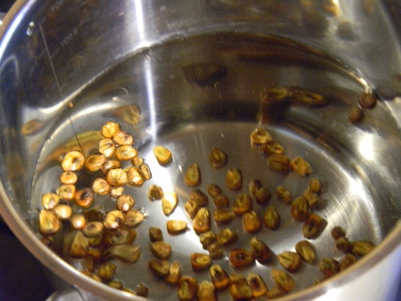 Vorbereitung: Die getrockneten Maiskörner in einem Sieb kurz abspülen und anschließend sehr gründlich mit einem Küchentuch trocknen.