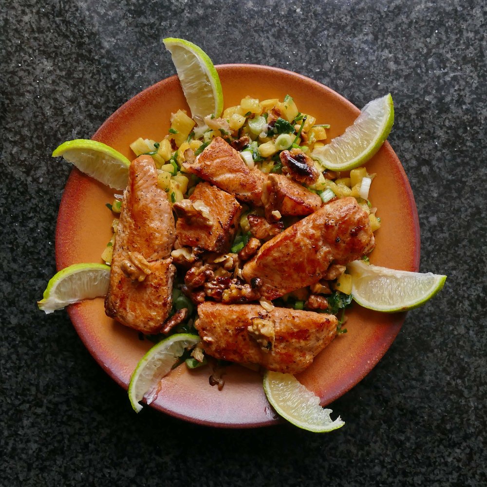 Zartes Lachsfilet mit einer fruchtig-nussigen Salsa aus Ananas, Walnüssen und Zitrusnoten – perfekt für ein sommerliches Dinner mit frischem Kräuteraroma.