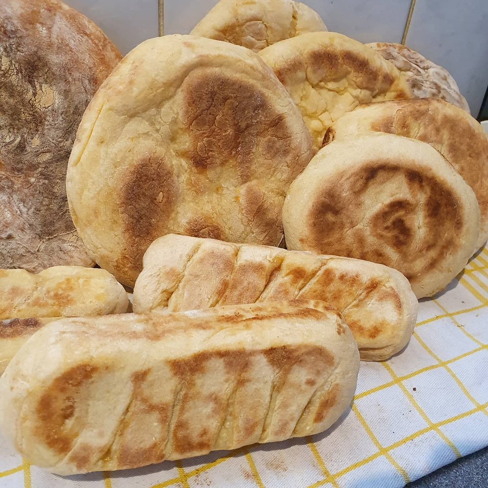 In einer beschichteten Pfanne oder auf einem heißen Basaltstein (falls vorhanden) bei mittlerer Hitze je Scheibe 3–4 Minuten pro Seite backen, bis sie goldbraun und leicht aufgegangen sind.