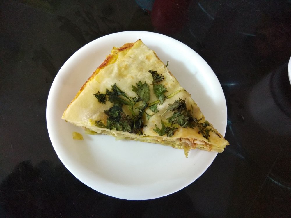 Den Chatti Pathiri im vorgeheizten Ofen bei 180 °C (Ober-/Unterhitze) für ca. 20–25 Minuten backen, bis die Oberseite goldgelb ist und die Ei-Masse gestockt ist. (Alternativ in der Pfanne mit Deckel auf niedrigster Stufe garen, dabei vorsichtig wenden).