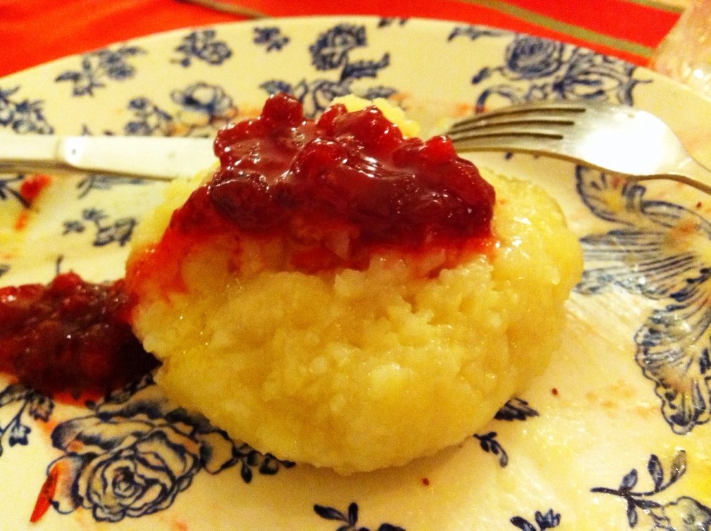 Mit geschmolzener Butter und Preiselbeerkonfitüre servieren.