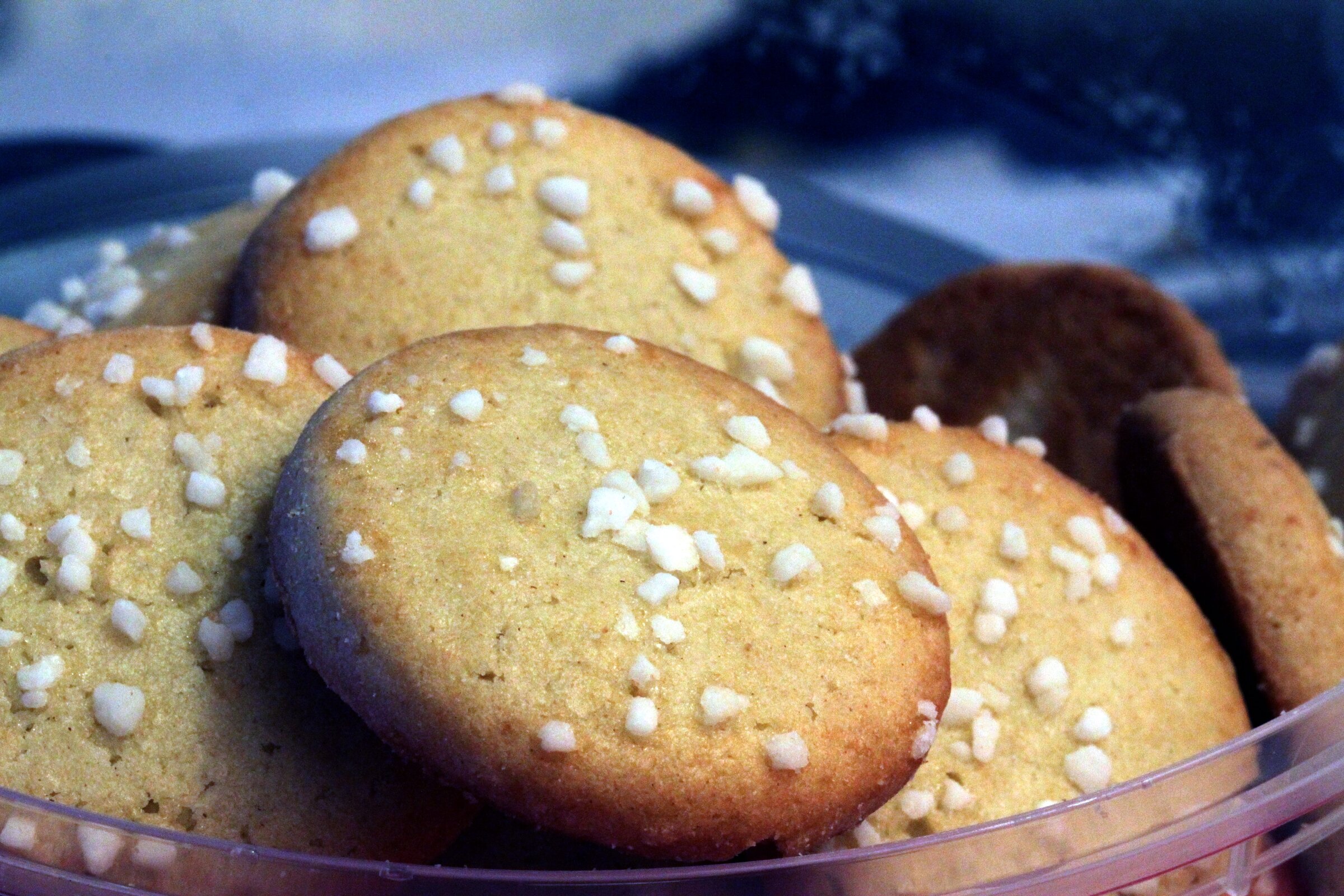 Zarte, norwegische Butterplätzchen, die traditionell zur Weihnachtszeit gebacken werden. Die mürben Kekse erinnern an Shortbread und werden klassisch mit Hagelzucker und Mandelsplittern verfeinert – ein knuspriger Hochgenuss für die Festtage.