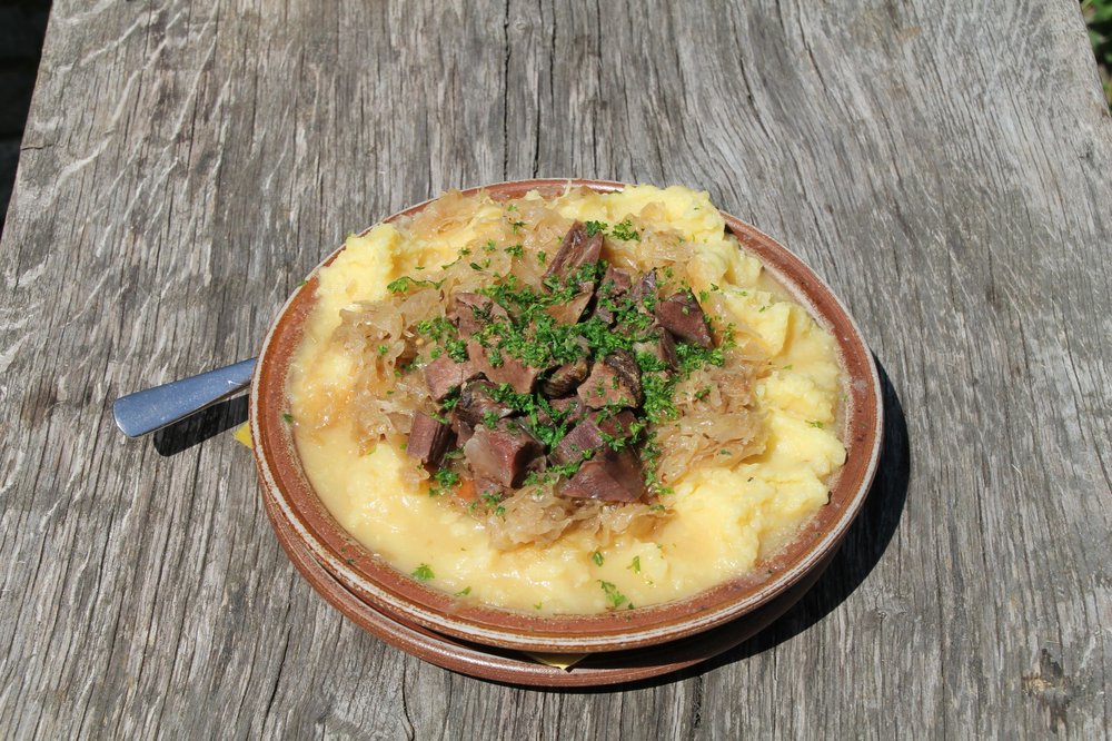 Ein traditionelles Gericht aus der Oberlausitz bestehend aus Kartoffelbrei, zartem Rindfleisch und viel kräftiger Brühe. Serviert mit Sauerkraut bildet die Brühe einen charakteristischen 'Teich' im Kartoffelstampf.