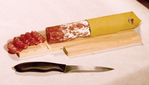 Nach der kurzen Reifezeit sollte die Salami noch weich und mild sein. Vor dem Verzehr die Haut abziehen und in dicke Scheiben schneiden.