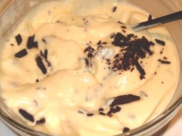 Rühre den abgekühlten Pudding mit dem Schneebesen noch einmal kräftig glatt, bis keine Klümpchen mehr vorhanden sind. Rühre nun den Rum unter. Hebe anschließend vorsichtig die Sahne und die Schokoladensplitter unter die Puddingmasse.