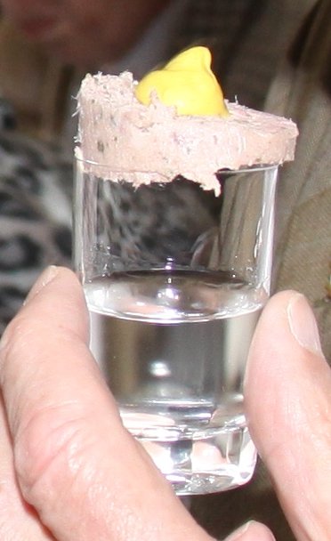Traditionell wird die mit Senf bestrichene Leberwurst auf den Rand des Schnapsglases gelegt oder auf einem Löffel dazu gereicht.