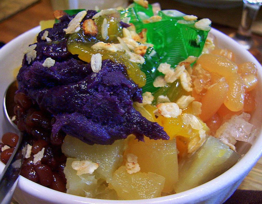 Das berühmte philippinische 'Mix-Mix' Dessert aus geschichtetem Eis, süßen Bohnen und tropischen Früchten. Ein farbenfroher, erfrischender Klassiker, der traditionell mit Kondensmilch und Ube verfeinert wird.