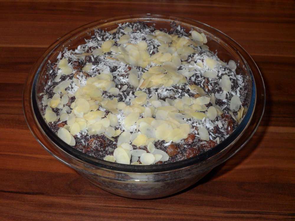 In einer großen Glasschüssel abwechselnd eine Schicht Brötchen und eine Schicht der heißen Mohnmilch einschichten, dabei mit Mohnmasse abschließen.