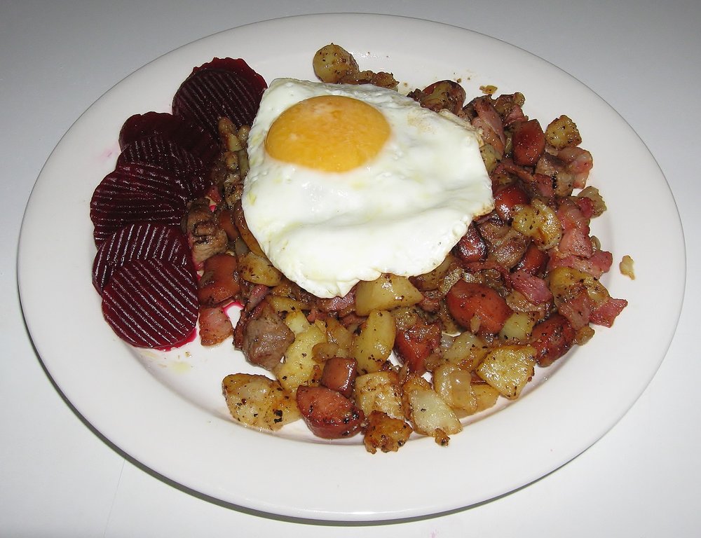 Ein deftiger Kartoffelauflauf aus der westfälischen Küche, der traditionell zur Resteverwertung von Schinken und Speck dient. Die Zutaten werden geschichtet und mit einer herzhaften Eier-Sahne-Mischung im Ofen überbacken.