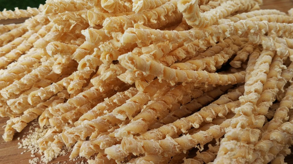 Busiate sind eine traditionelle Pastaform aus der Provinz Trapani im Westen Siziliens. Ihr Name leitet sich vom 'Busa' ab, dem Stängel eines lokalen Grases, um den der Teig früher gewickelt wurde, um die charakteristische Spiralform zu erhalten, die Saucen besonders gut aufnimmt.