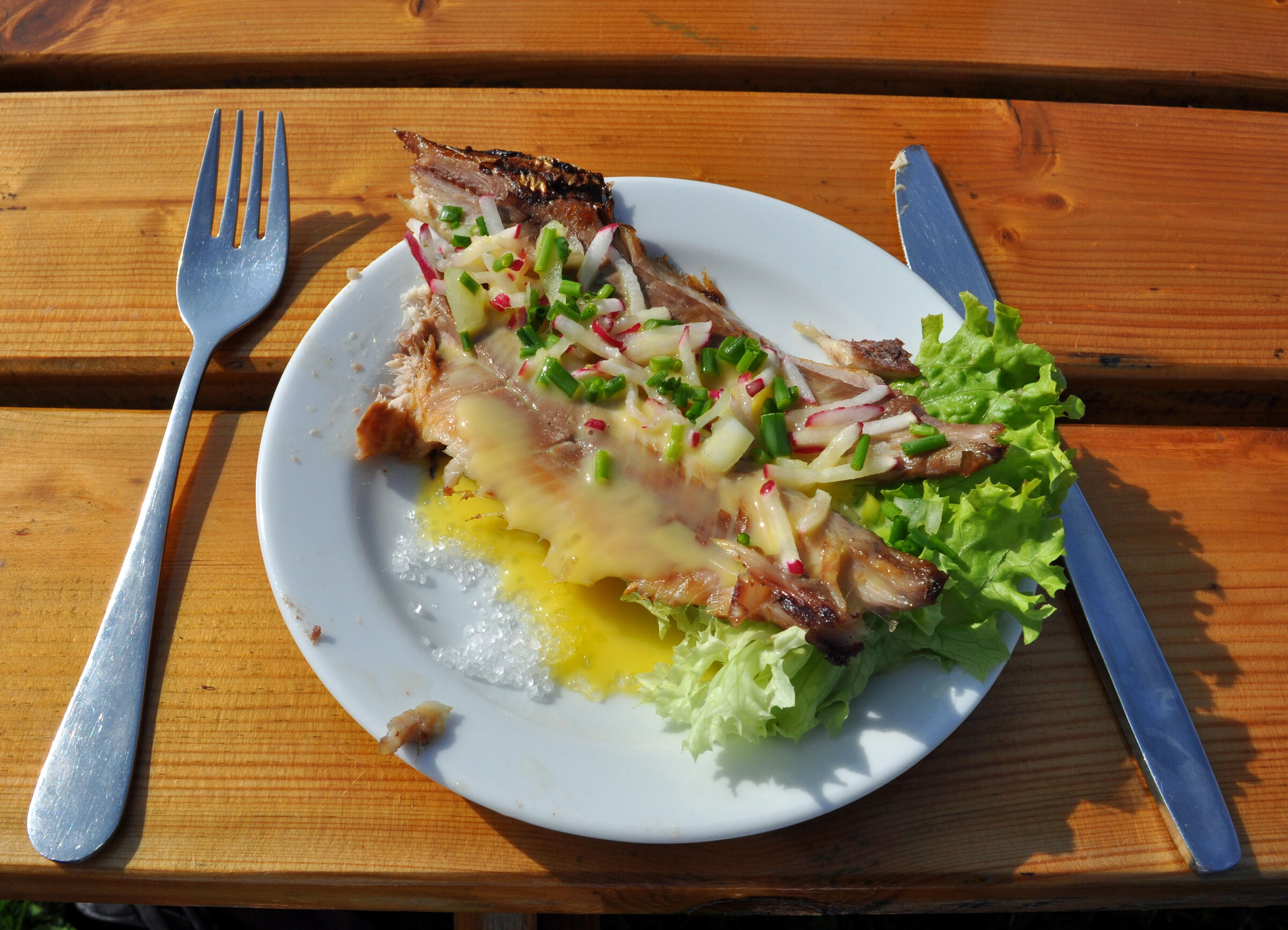 Entferne vorsichtig die Haut und die Gräten vom Räucherhering, sodass saubere, grätenfreie Filetstücke übrig bleiben.
